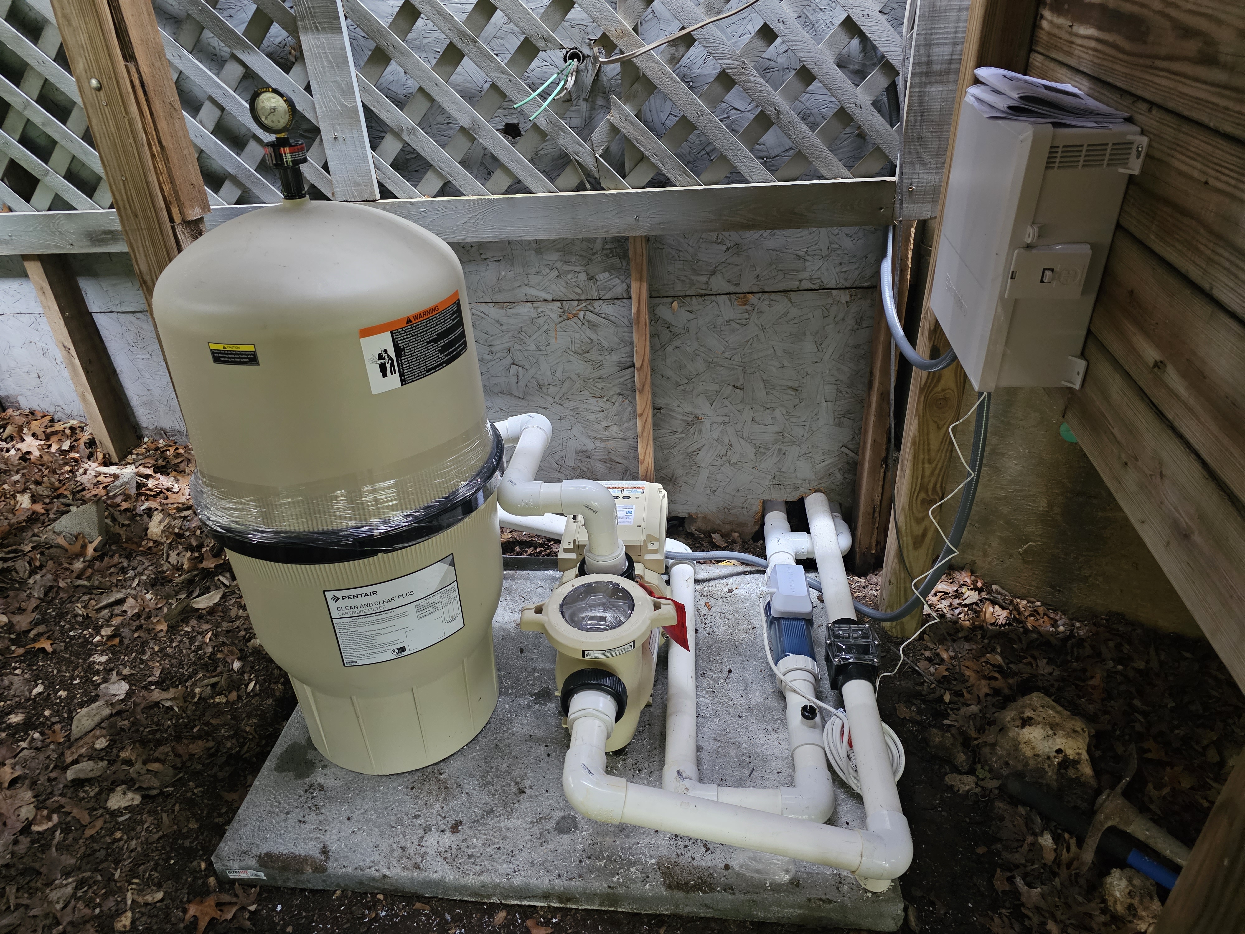 This equipment in the picture above, was installed after all plumbing was moved to a new location from being under the house. This pool was also converted to a salt pool in the process.